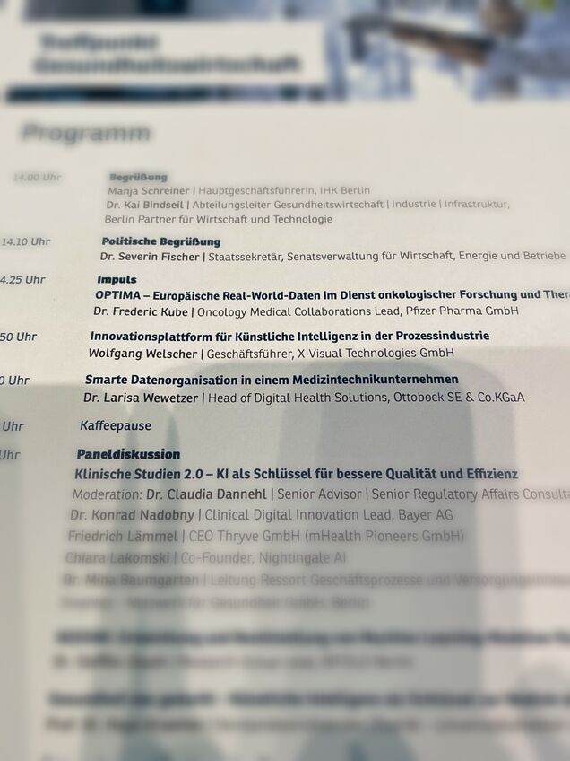 Am 8. Dezember 2025 fand im Ludwig-Erhard-Haus in Berlin der „Treffpunkt Gesundheitswirtschaft 2025“ statt, zu dem das Cluster Gesundheitswirtschaft Berlin-Brandenburg gemeinsam mit der IHK Berlin eingeladen hatte. Fachleute aus Gesundheitswirtschaft, -wissenschaft und -Versorgung kamen zusammen, um aktuelle Entwicklungen, datengetriebene Innovationen und den Einsatz von Künstlicher Intelligenz in der Gesundheitswirtschaft zu diskutieren.