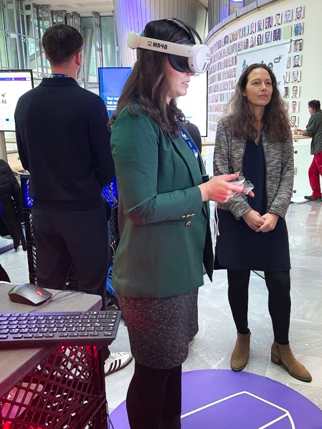 Der Tag bot neben den Vorträgen im KI-Showroom der IHK Berlin die Möglichkeit, weitere innovative KI-Projekte aus der Gesundheitswirtschaft kennenzulernen. Wir präsentierten das Projekt KEPLER aus dem WIR!-Bündnis MR4B. Gemeinsam mit der Hochschule für Technik und Wirtschaft Berlin, der Technischen Universität Berlin, Pruess Technologies, se.services und BAS-Solutions entwickeln wir in diesem Projekt, gefördert vom Bundesministerium für Forschung, Technologie und Raumfahrt, eine Anwendung zur 3D-Aufstellungsplanung im Anlagenbau. Die Anwendung integriert BIM- und DEXPI-Daten und ermöglicht allen Gewerken eine effiziente, kollaborative Zusammenarbeit. Über die Meta Quest 3 Datenbrille konnten die Besucher ein 3D-Anlagenmodell virtuell begehen und den Ansatz direkt erleben.